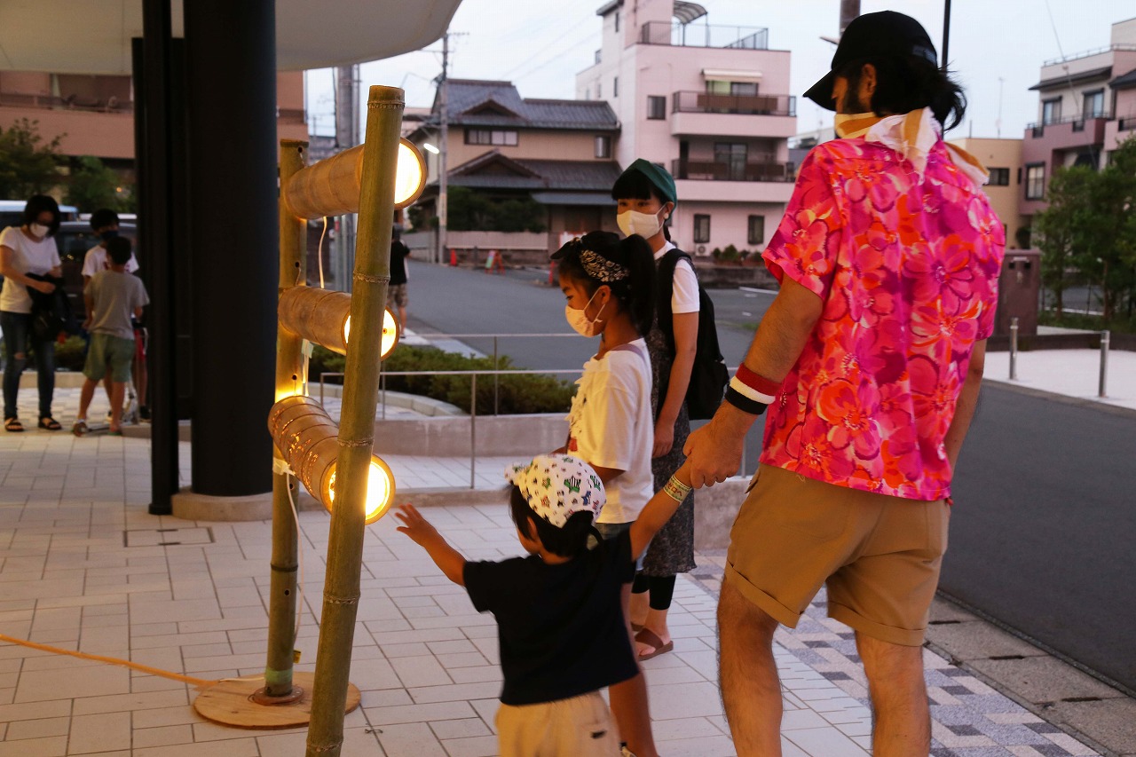 8月7日から9日まで、プラザきくるで竹灯籠展が開催されました。「新たな賑わいを創出する場所」として、3月にオープンした市役所庁舎東館「プラザきくる」を舞台に、竹灯籠の幻想的な灯りが夏の夜を彩りました。新型コロナウイルス感染症の影響で、菊川夏の風物詩である「夜店市」をはじめ、さまざまな夏のイベントが中止になる中、「夏の夜を楽しむ機会」として、菊川市賑わいづくり研究会が主催。竹灯籠は、外階段やテラスなどの屋外に設置され、「3密」を避けた環境づくりに配慮して開催されました。