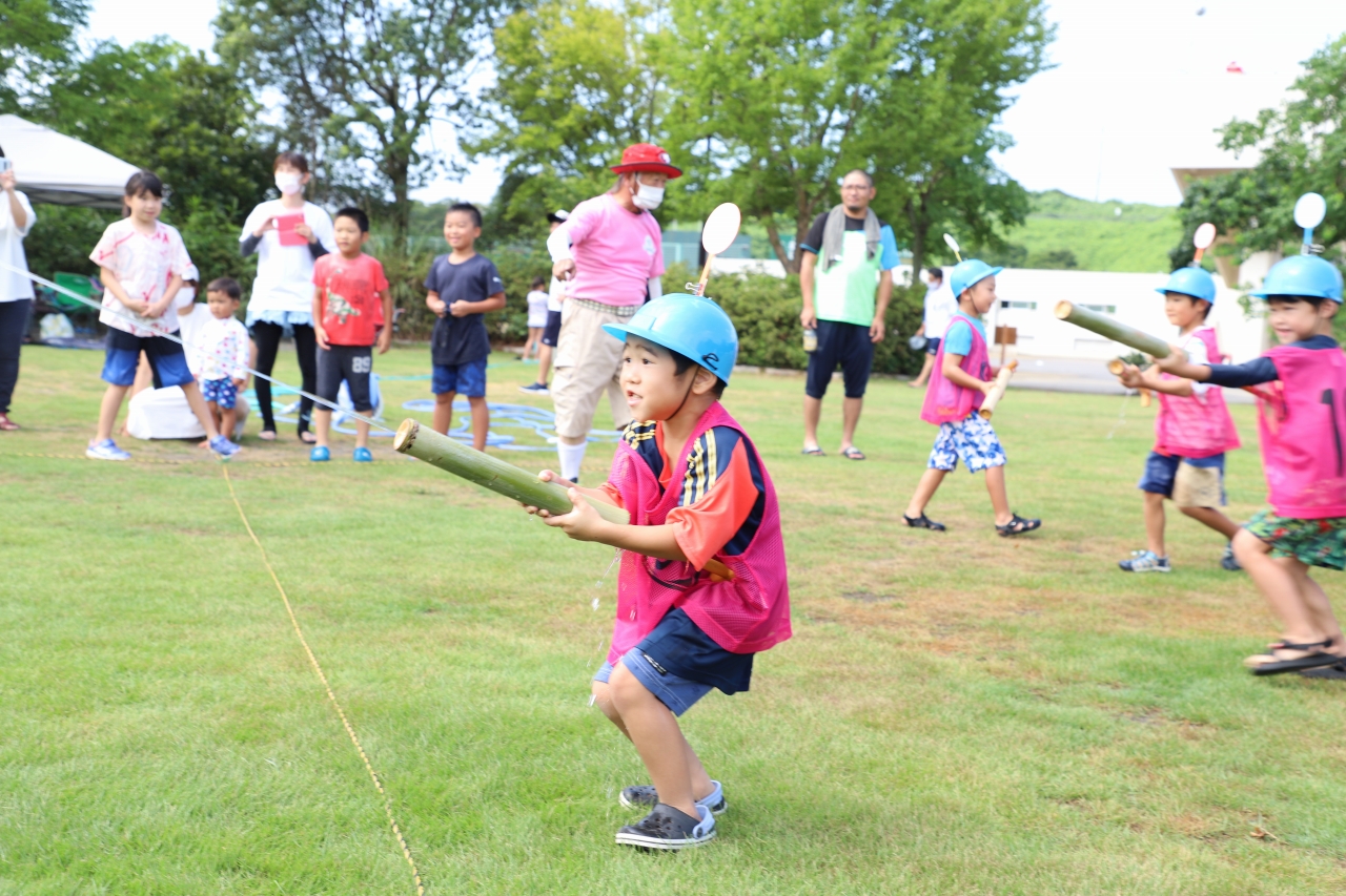 8月23日、菊川運動公園芝生広場で「水鉄砲合戦」が開催されました。昔の遊び体験や親子のふれあいなどを目的として開催されている夏の恒例行事。15回目となる今年は、園児や小学生およそ120人が参加しました。子どもたちは、的となる金魚すくいで使うポイを付けたヘルメットをかぶり、市内の竹を伐採して作った竹筒の水鉄砲を使って試合を行いました。びしょ濡れになりながら芝生を駆け回り、的を狙って撃ち合いました。会場には子どもと父兄の楽しそうな歓声が響いていました。