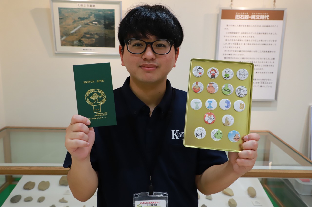 景品は、昨年も好評だった「勾玉づくりキット」のほか、今年から「どきどきオリジナルマグネット」と「どきどきオリジナルメモ帳」が加わりました。メモ帳は、発掘現場でもよく使われる方眼紙タイプのもので、表紙には、市内の横穴墓で出土した古墳時代の「塚頭」のイラストが豪華な箔押しで描かれています。